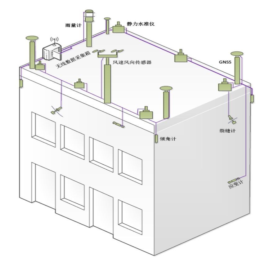 巨维建设危房智能变形监测系统是通过基于北斗 /GPS 的高精度卫星定位系统 GNSS、数字化倾斜仪、数字化裂缝计、数字化静力水准仪等监测设备,对房屋的位移、沉降、倾斜、裂缝、应力应变等形变数据进行实时监测,并由通讯网络将数据实时传回到监测大数据平台“巨维云”,系统实时监测房屋的形变数据,在发生重大险情前及时预警,让群众提前撤离,保障群众生命安全